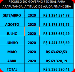 Trata-se da rubrica Ajuda Financeira aos Municípios, vinda do Governo Bolsonaro, que destinou recursos para Araputanga nos meses: abril, maio, junho, julho, agosto e setembro no total de R$5.396.390,41. De acordo com a previsão, o recurso continuará sendo destinado aos municípios brasileiros, pelo menos, até dezembro/2020.