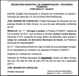 O prefeito Joel Marins acatou o pedido do Secretário e revogou a Portaria. A reportagem obteve a informação que passa a responder interinamente pela pasta da Saúde, inicialmente pelo período de trinta dias, o servidor José Ricardo Ribeiro.
