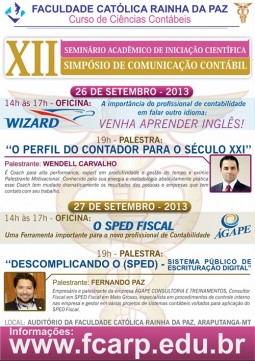 A Faculdade Católica Rainha da Paz, através da Coordenação do Curso de Ciências Contábeis, convida para o XII SEMINÁRIO ACADÊMICO DE INICIAÇÃO CIENTÍFICA E XII SIMPÓSIO DE COMUNICAÇÃO CONTÁBIL a ser realizado nos dias 26 e 27 de setembro de 2013, no Auditório da FCARP, com a seguinte programação: