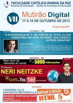 A FCARP – Faculdade Católica Rainha da Paz, através da Coordenação dos Cursos de Gestão da Tecnologia da Informação e Sistemas de Informação, realizará, nos dias 17, 18 e 19 de outubro, o VII Mutirão Digital.