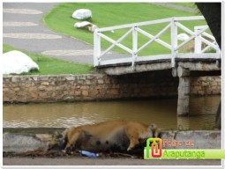 Moradores das imediações do Lago Azul em Araputanga estão indignados com um cão que morreu ou foi abandonado morto nas imediações da margem direita em direção ao norte do Lago.