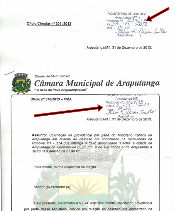 Assunto: Solicitação de providência por parte do Ministério Público de Araputanga em relação ao descaso ora encontrado na restauração da Rodovia MT - 174 que interliga o trevo denominado “Cacho” à cidade de Araputanga na extensão de 62,37 Km, e no sub trecho entre Araputanga à Jauru na extensão de 67,99 km.