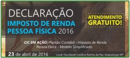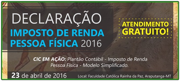 CIC EM AÇÃO: Plantão Contábil - Imposto de Renda Pessoa Física - Modelo Simplificado. DOCUMENTOS NECESSÁRIOS: CPF, Título de Eleitor, informe de rendimentos referente a 2015, cópia da declaração e recibo de entrega da declaração do ano de 2015, comprovantes de compra e venda de imóveis, veículos relativos ao período de 2015.
