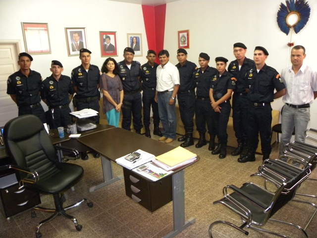 LEGENDA: Novos policiais sendo recepcionados pelo prefeito, secretários de administração e de finanças e o capitão da PM