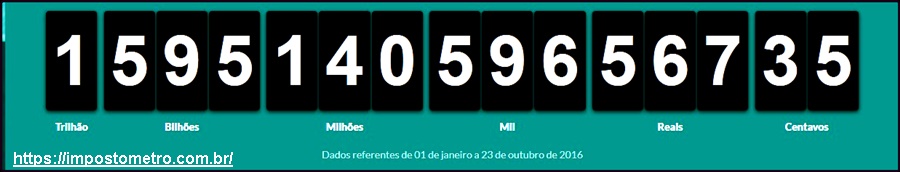 Impostômetro da Associação Comercial de São Paulo (ACSP) registrá, às 8 horas de segunda-feira (24/10), a marca de R$ 1,6 trilhão. O valor representa o total de impostos, taxas e contribuições pagos pela população brasileira desde o começo do ano.