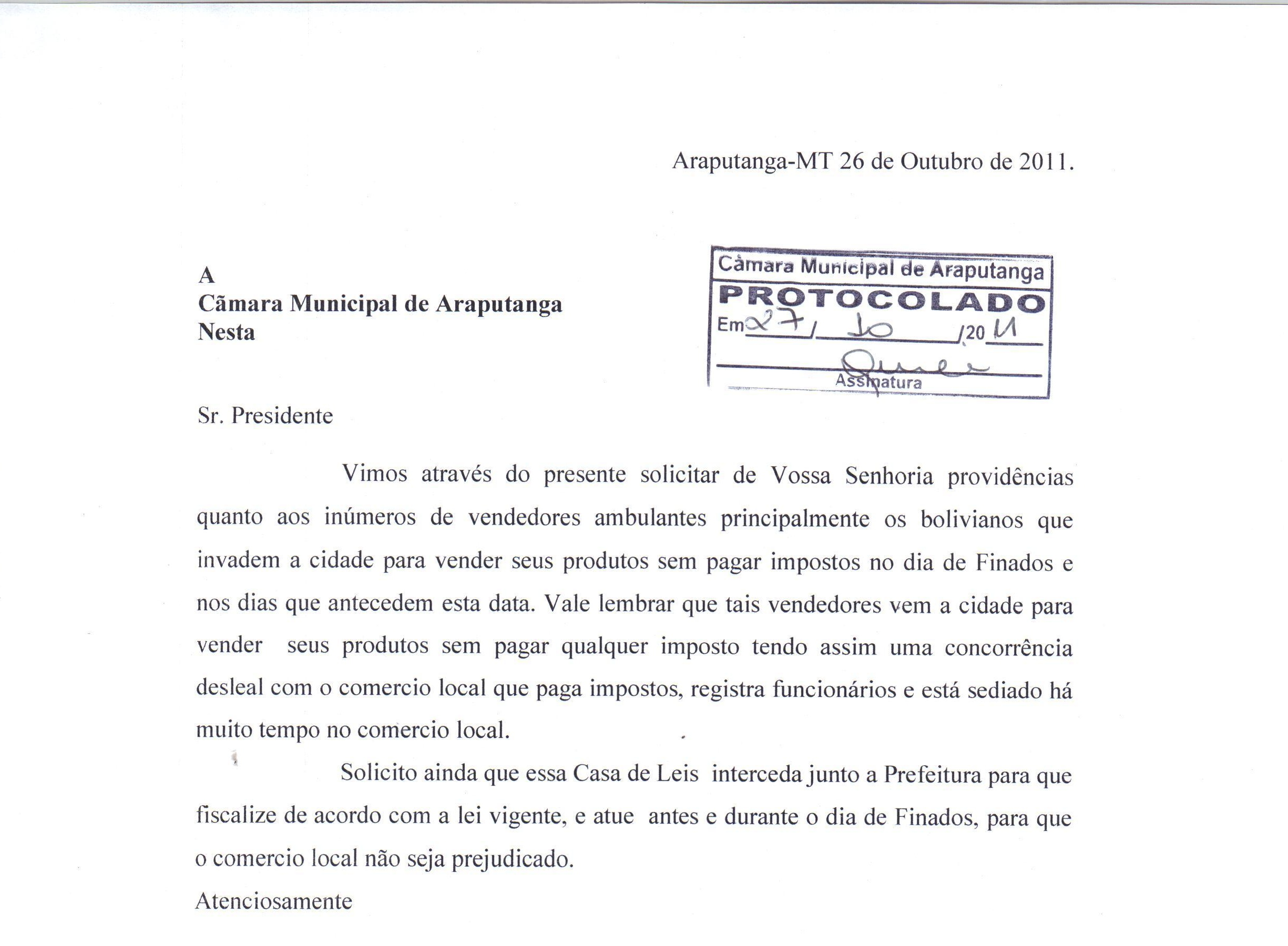Comerciantes de Araputanga protocolaram, ontem, documento que pede providências ao presidente da Câmara Municipal, quanto aos ambulantes que invadem a cidade vendendo produtos, sem pagar impostos, no dia de finados e nos dias que antecedem a data.