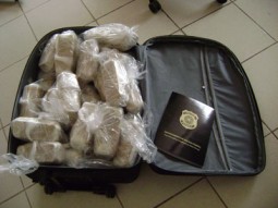 A Polícia Federal prendeu hoje, 19, um homem com 50,480 quilos de pasta base de cocaína no meio de uma carga de farelo de arroz, dentro de um caminhão. Os 51 volumes da droga estavam acondicionados numa mala escondida entre as sacas de farelo.