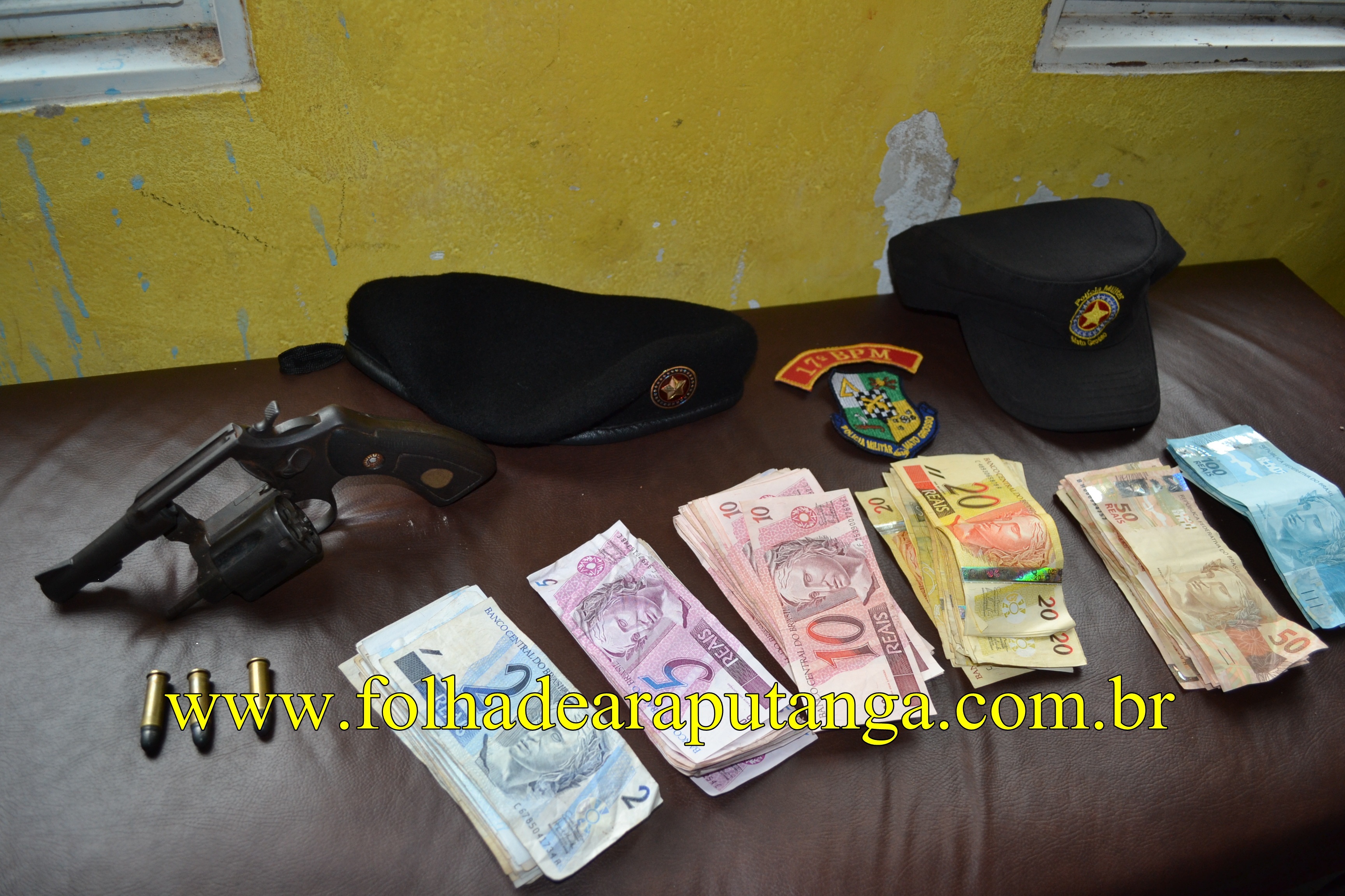 O valor recuperado (foto) com um dos bandidos é de R$3.153,00. Além do dinheiro policiais do 17º BPM de Araputanga apreendeu, também, o revólver da marca Taurus nº 2146031 e, três munições intactas, que não foram deflagradas, mas estavam todas picotadas pelas diversas tentativas que o assaltante fez para disparar a arma contra a funcionária dos Correios.
