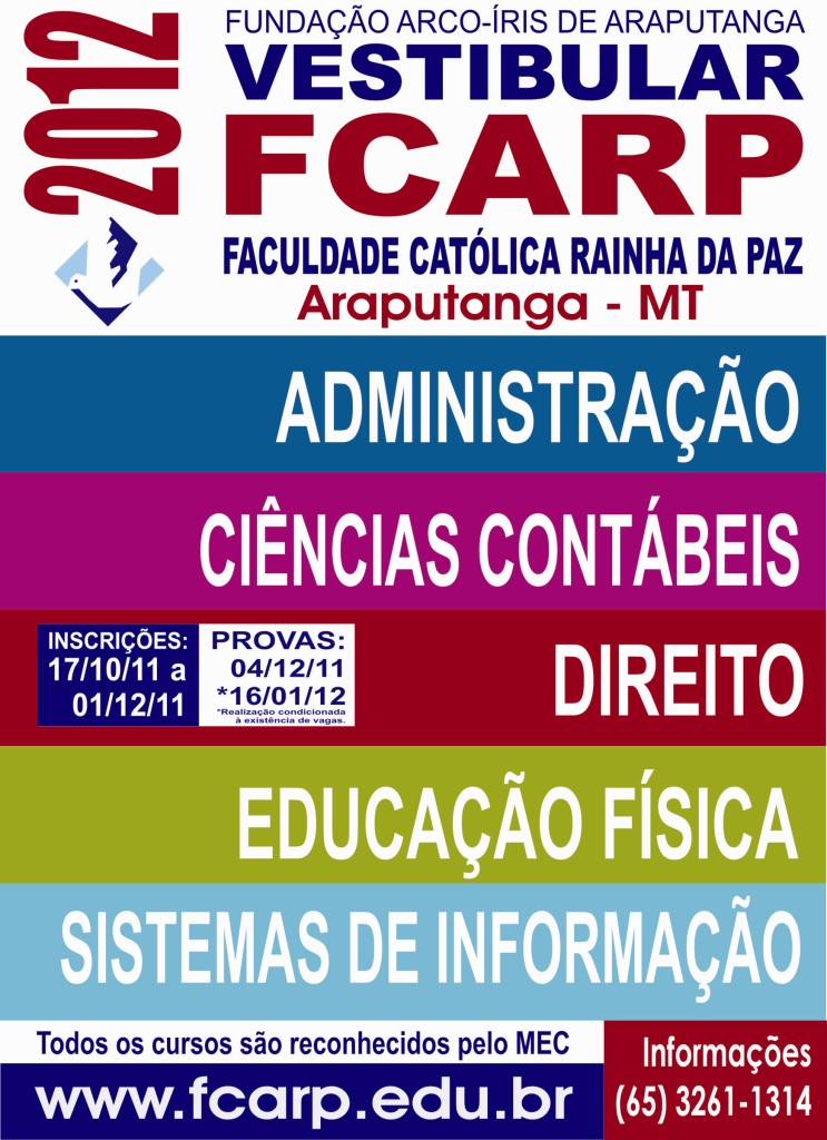 A Faculdade Católica Rainha da Paz realiza, no dia 19 de janeiro, no Centro Cultural Paulo VI, em Araputanga, a solenidade de Colação de Grau Unificada, para formandos 2011 dos cursos de Administração, Ciências Contábeis, Direito, Educação Física e Sistemas de Informação.