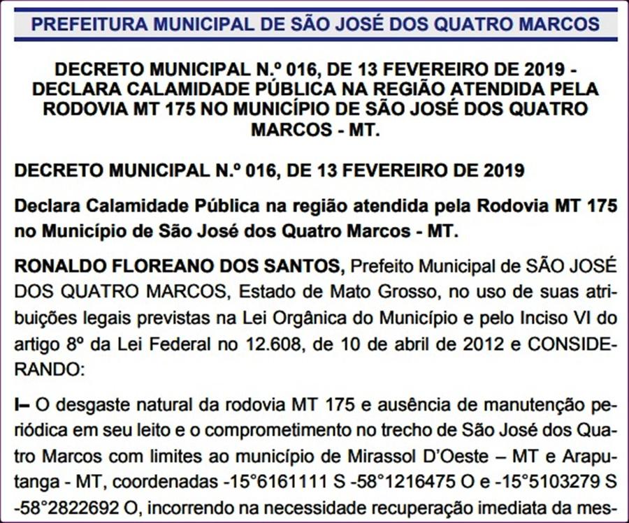 A publicação agora é oficial e surge através do Decreto Municipal N.º 016 de 13/02/2019 publicado no Diário Municipal de Mato Grosso, edição nº 3.172 de 21/02/2019 indicando como trecho em calamidade pública, o trajeto da MT-175 que atende ao território do município quatromarquense.