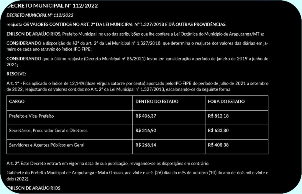 DA REDAÇÃO - O município de Araputanga reajustou em 12,14% o porcentual sobre os valores das diárias.