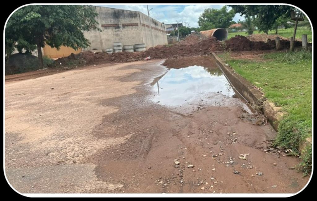 O cenário próximo à obra temporariamente paralisada, pede às Autoridades que suspendam o recesso e tome medidas imediatas para escoar o pequeno reservatório de água que se formou junto ao meio-fio do asfalto, evitando o possível surgimento de focos do mosquito e consequentemente de pessoas acometidas por dengue.