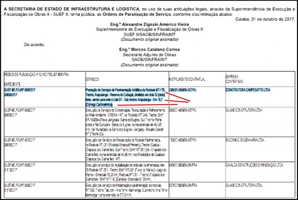 A Superintendência de Execução e Fiscalização de Obras (SUEF), emitiu, no dia 31 de outubro/17 ordem de paralização dos serviços de pavimentação asfáltica da Rodovia MT-175, trecho Araputanga – Reserva do Cabaçal, lote 01, sub trecho no município de Araputanga, km 18,7 Córrego Cachoeirinha; a obra há muito paralisada, agora recebe autorização oficial para manter o status quo.