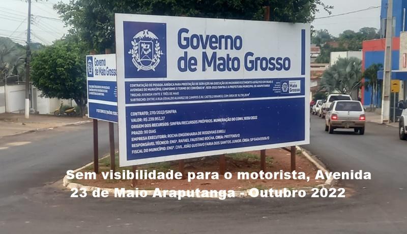 Pois bem, quem vai chegando a Araputanga e percorre a Av. 23 de Maio, no sentido centro, vê apenas o anverso da placa que, na verdade, tem sua frente direcionada para quem vem da escola Anchieta