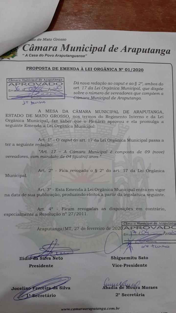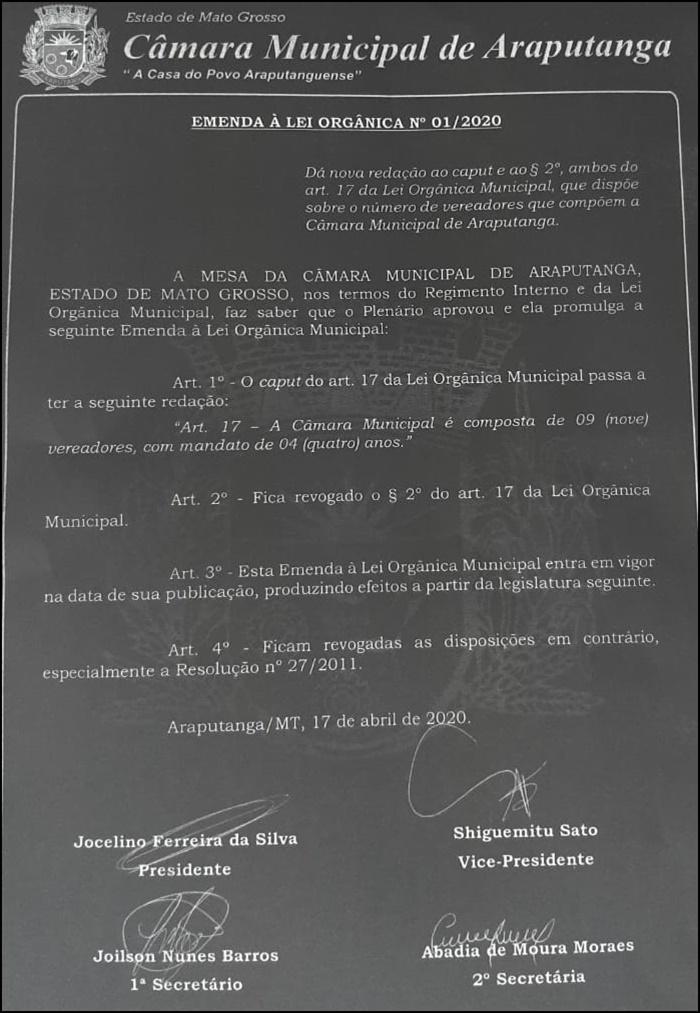 A votação favorável à redução no número de vereadores no Legislativo Municipal, emenda a Lei Orgânica, determinando que já na próxma eleição, prevista para outubro/2020 haja redução de onze para apenas nove vereadores em Araputanga.