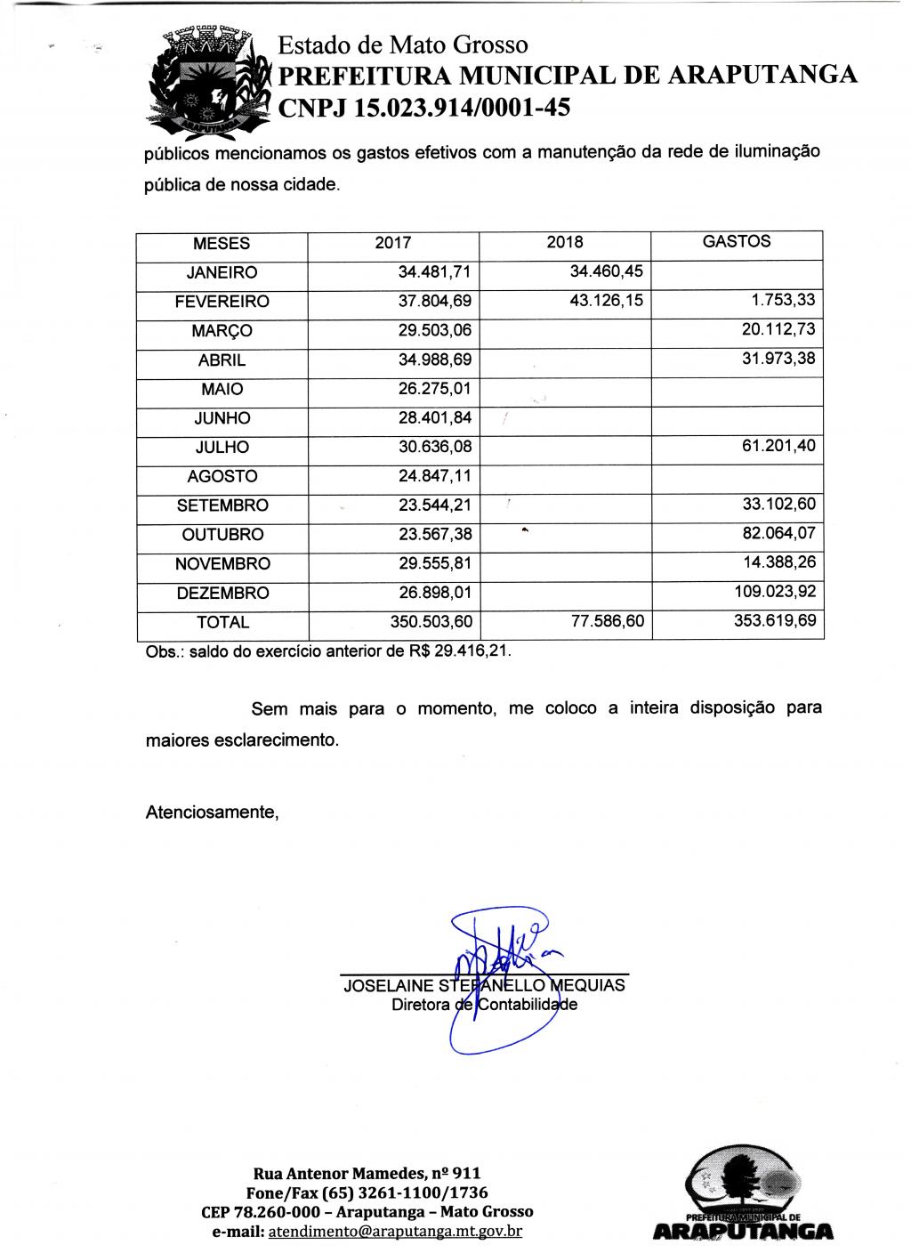 No documento obtido pela Folha de Araputanga a Gestão demonstra que investiu R$353.619,69 durante o ano de 2017 em iluminação pública.