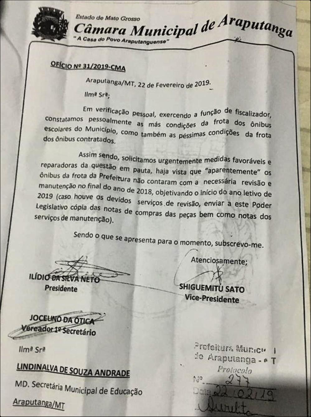 O ofício assinado pelos vereadores, recebeu número 277 ao ser protocolizado na Prefeitura.