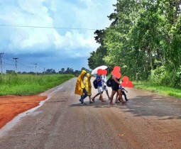 ARAPUTANGA – Crianças atravessam pista da MT-175 para embarque no transporte escolar