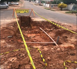 O empenho da Administração na busca de localizar o problema, deixa enormes buracos, que embora estejam sinalizados, demonstra que o problema é persistente, e está obrigando a própria gestão municipal, a ‘atacar’ a via pública.