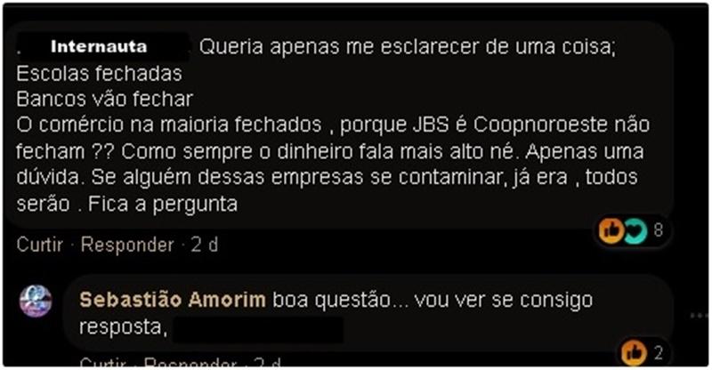 Como ponto alto do questionamento, surgiu a pertunga: por que a JBS e a Coopnoroeste não fecham? E, de acordo com conclusão do reclamante virtual, o dinheiro fala mais alto né. Apenas uma dúvida... Se alguém dessas empresas se contaminar, já era, todos serão. Fica a pergunta