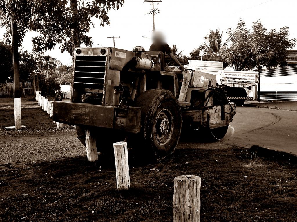 Uma máquina velha e pesada, de propriedade da Prefeitura Municipal de Araputanga, quebrou uma parte mecânica, fazendo o operador perder o controle da direção, sair da via púbica, subir o meio-fio e só parar quando a parte traseira da velha máquina, foi suspensa por um toco de aroeira, de aproximadamente sessenta centímetros de altura.