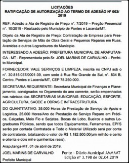 por - Sebastião Amorim - O Município de Araputanga aderiu à Ata de Registro de Preços 07/2019, pregão presencial nº 10/2019 realizado pela gestão de Pontes e Lacerda. A adesão foi ratificada e autorizada pela publicação do termo de adesão 03/2019.