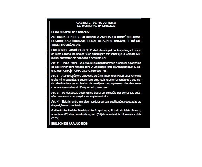 por – Sebastião Amorim – Os vereadores do município, aprovaram lei nº 1.550/2022 autorizando o Poder Executivo Municipal de Araputanga a ampliar o convênio com o Sindicato Rural de Araputanga/MT.