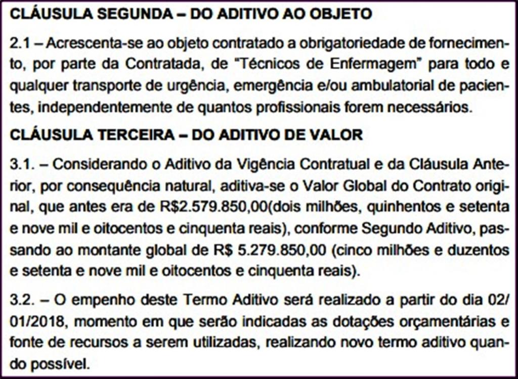 Com o aditivo acrescido em três milhões de reais, a unidade hospitalar privada, obrigatoriamente fornecerá técnicos de enfermagem para todo e quaisquer transportes de urgência, emergência e/ou ambulatorial de pacientes, independentemente de quantos profissionais forem necessários. Todas as demais cláusulas e condições do Contrato Original, que não foram alteradas pelo terceiro aditivo, continuam em vigor