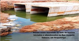 Hoje (02/02), populares que compareceram para conferir a obra paralisada encontraram peixes morrendo e outros já mortos, ao lado dos bueiros da Joaquim Nabuco. É preciso dizer que há cerca de quinze dias, o Portal Ara_News gravou vídeo demonstrando que peixes estavam condenados à morte, no mesmo Córrego, na obra dos bueiros da Avenida 23 de maio. Vale repetir o núcleo da frase final do parágrafo anterior: Quem se importará?