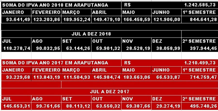 A Redação da Folha promoveu levantamento, junto ao Portal do Banco do Brasil e descobriu que o Município de Araputanga recebeu nos 24 meses que compreendem os anos de 2017 e 2018 R$ 2.453.085,46 (Dois Milhões, Quatrocentos e Cinquenta e Três Mil, Oitenta e Cinco Reais e Quarenta e Cinco Centavos), destinados à rubrica IPVA.