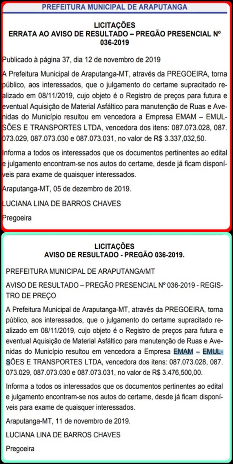 De acordo com a publicação, a vencedora é a empresa EMAM – Emulsões e Transportes Ltda. O valor também foi corrigido para R$3.337.032,50. Veja recorte das publicações no Diário Municipal da AMM/MT, abaixo: