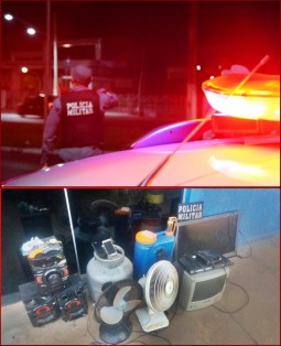 Dois ventiladores, duas televisões, um relógio de pulso, um botijão de gás, três celulares, sendo um deles o da vítima assaltada por L.P.R., um receptor de antena, um DVD, um aparelho de som, uma balança de precisão e R$ 42 . Os dois homens foram entregues na Delegacia de Polícia local para as demais providências legais.