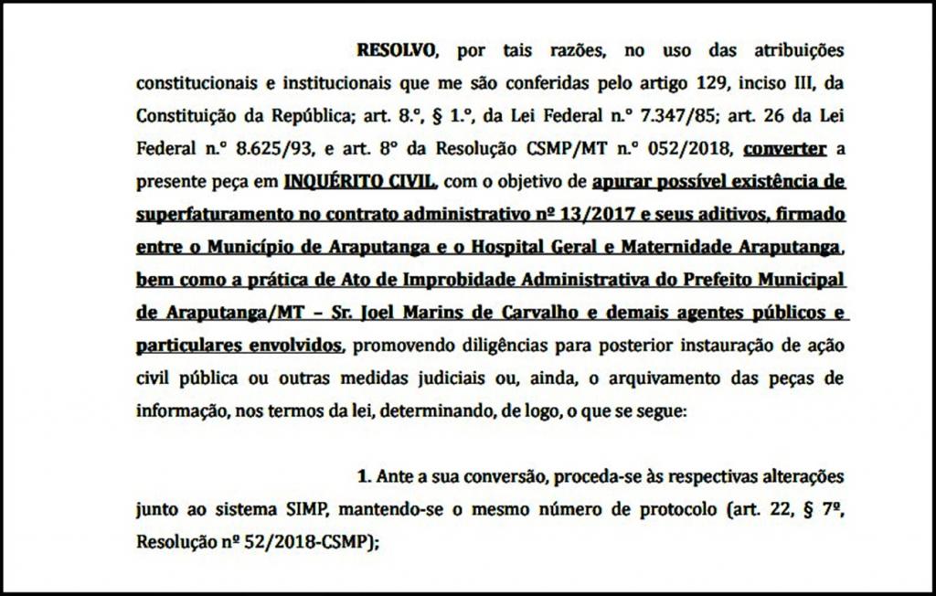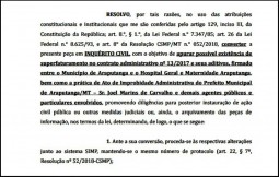 O Ministério Público de Mato Grosso, promotoria de Araputanga, instaurou novo Inquérito Civil, neste dia 19 de abril/2018. Trata-se da Notícia de Fato, convertida na Portaria 07/2018. De acordo com o documento que a Redação da Folha teve acesso, aportou na Promotoria de Justiça, denúncia acerca do “Terceiro Termo Aditivo ao Contrato Administrativo nº 013/2017, firmado entre o Município de Araputanga e o Hospital Geral e Maternidade Araputanga.