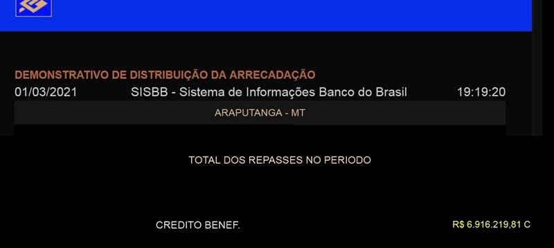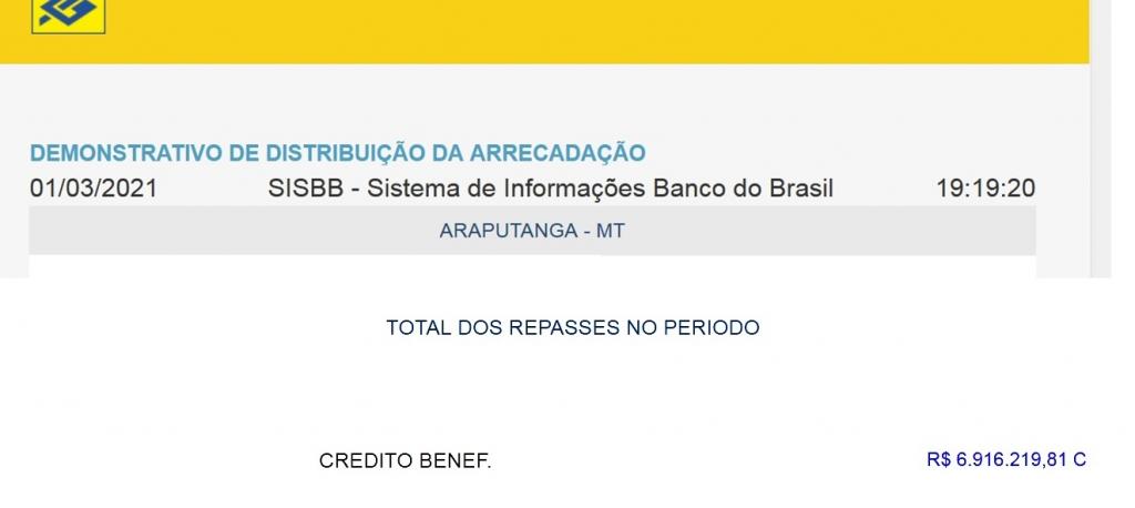 por - Sebastião Amorim - As Transferências Constitucionais depositadas nas contas do município de Araputanga entre primeiro de janeiro a 28 de fevereiro de 2021 já acumularam R$6.916.219,81 (seis milhões novecentos e dezesseis mil, duzentos e dezenove reais e oitenta e um centavos).