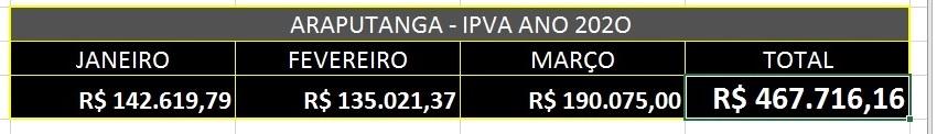 O primeiro trimestre de 2020 último ano da gestão Joel Marins, o pagamento do IPVA foi bastante gordo, em favor de Araputanga. Veja na imagem a seguir: