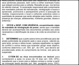 Na data de 23/02/2022 o magistrado Carlos Roberto Barros de Campos deferiu o pedido liminar dos autores e determinou a reintegração de posse da parte autora na área invadida da Fazenda Barrinha, localizada a 12 km da Comunidade de Farinópolis, e determinou ainda a expedição de ofício a Secretaria de Segurança Pública para que seja disponibilizado efetivo suficiente para cumprimento da ordem, arbitrando ainda multa de r$ 1.000,00 (um mil reais) por dia e por pessoa no caso de descumprimento da ordem judicial.