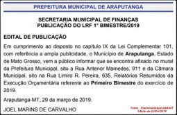 O documento está publicado no Jornal Eletrônico dos Municípios, cuja audiência é baixíssima junto à população; O edital de publicação, de iniciativa da Prefeitura de Araputanga, pode ser lido na Edição número 3.198 de 02/04/2019 página 14.