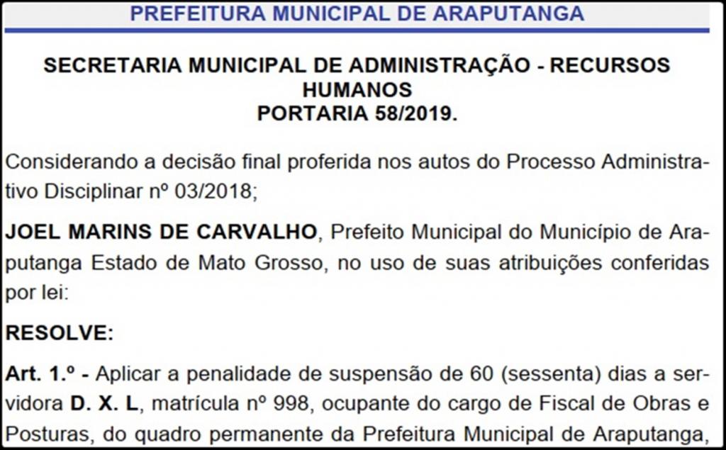por – Sebastião Amorim - A Secretaria Municipal de Administração Sessão Recursos Humanos da Prefeitura Municipal de Araputanga, aplicou penalidade de suspensão de sessenta dias, através da Portaria 58/2019 contra a servidora ocupante do cargo de Fiscal de Obras e Posturas, do quadro permanente da Prefeitura.