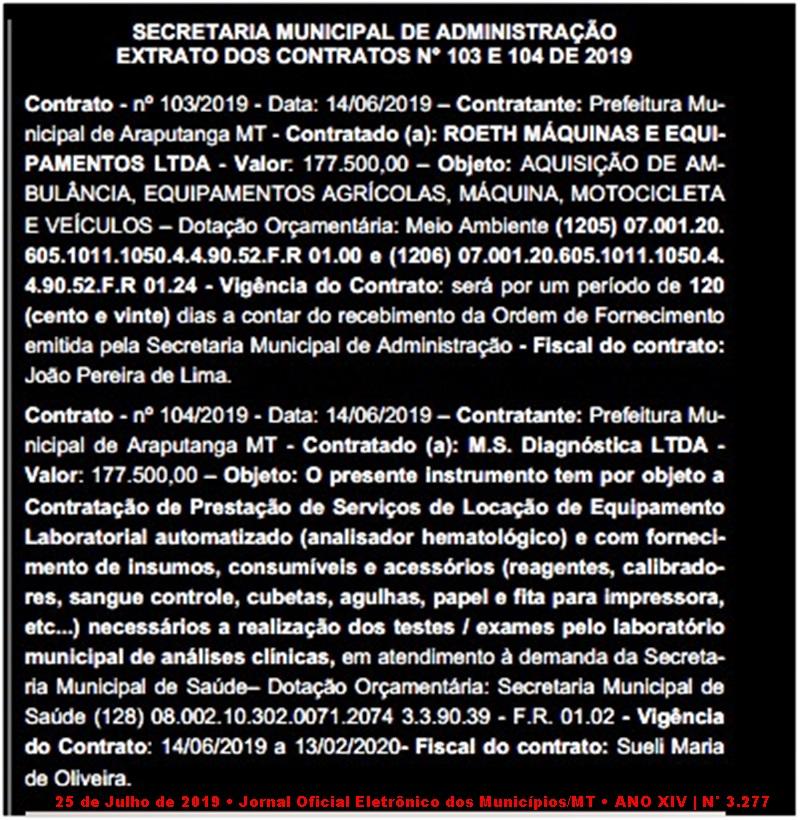 Os contratos datados de 14/06/2019 foram publicados no Diário Municipal/MT edição nº 3.277 do dia 25/07/2019 registrados pelos números 103/2019 no valor de R$177.500,00 (Cento e Setenta e sete mil e quinhentos reais), tendo por contratada a empresa Roeth Máquinas e Equipamentos Ltda, para fornecer, no prazo de cento e vinte dias, ambulância, equipamentos agrícolas, máquina, motocicleta e veículos.