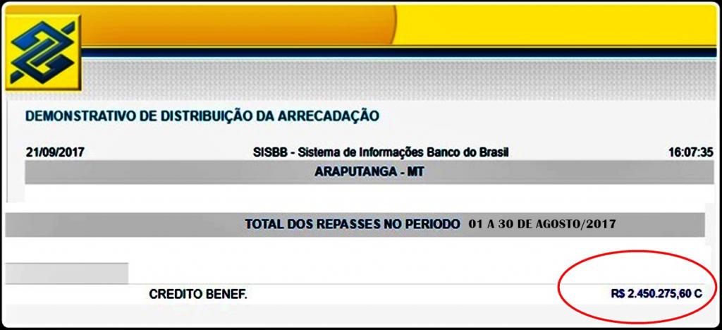 ARRECADAÇÃO – Araputanga recebeu R$2,45 milhões de reais em agosto/2017