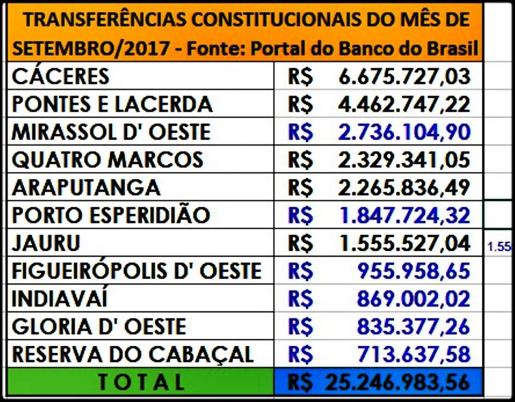 Comparado com o mês de Agosto/17, Araputanga recebeu R$ 184.439,11 a menos em suas contas, no mês de Setembro, apesar da baixa no valor transferido, no nono mês da gestão, o Prefeito Joel Marins e seu staff contaram com R$ 2.265.836,49 (Dois Milhões, Duzentos e Sessenta e Cinco Mil, Oitocentos e Trinta e Seis Reais) somente a título de transferências (sem contar a arrecadação local de impostos como ISSQN, ITBI, Taxas, Multas, Serviços etc, que a reportagem ainda não obteve acesso); veja o quadro abaixo.