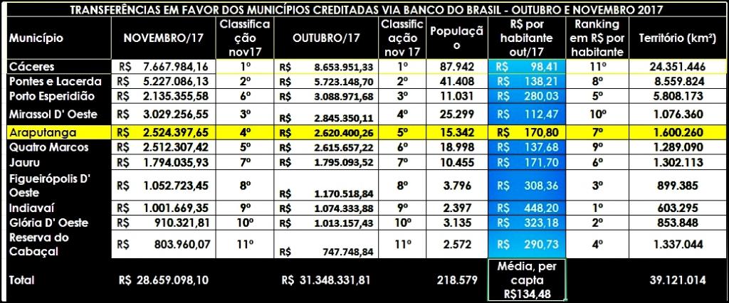 Nos trinta dias de novembro/17, os municípios de Cáceres, Pontes e Lacerda, Porto Esperidião, Mirassol D’ Oeste, Araputanga, Quatro Marcos, Jauru, Figueirópolis D’ Oeste, Indiavaí, Glória D’ Oeste e, Reserva do Cabaçal,  obtiveram R$28.659.098,10 (Vinte e oito Milhões, seiscentos e cinquenta e nove mil, noventa e oito reais e dez centavos) contra R$31.348.331,81 (Trinta e um milhões, trezentos e quarenta e oito mil, trezentos e trinta e um reais e oitenta e um centavos) recebidos em outubro.