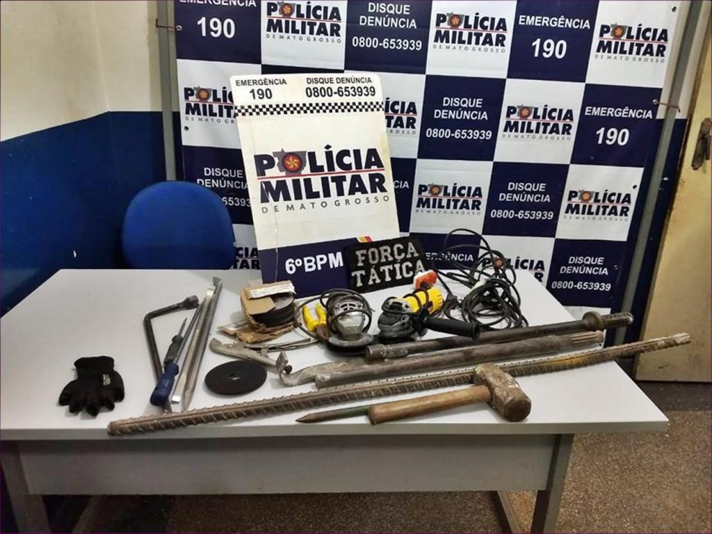 A Polícia localizou e apreendeu os seguintes instrumentos, próximo ao cofre, momento em que foi percebido o buraco na parede da Loja, acessada através de uma oficina: