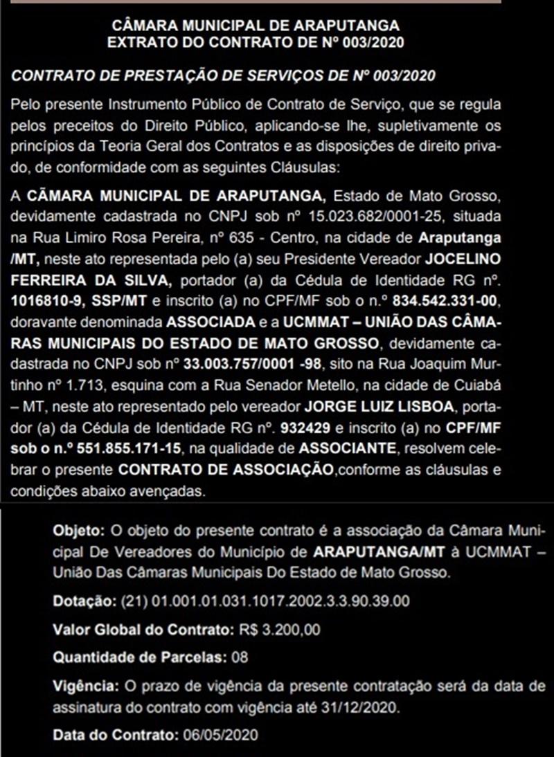 Pela “filiação” à entidade, os cofres da Câmara de vereadores de Araputanga desembolsarão R$3.200,00 (três mil e duzentos reais), no período de oito meses, com vigência entre 06 de maio a 31 de dezembro/2020.