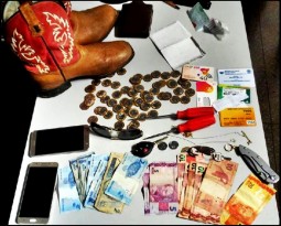Entre os produtos recuperados estão dois celulares J7, uma chave de veículo Toyota, uma bermuda jeans, uma camisa Fido Dido azul, um óculos de sol, um canivete inox, duas correntes douradas, sendo uma com pingente, dois anéis dourados, uma carteira de couro, um cartão de crédito, duas chaves de fenda, uma bota Terra de Peão e R$ 173,10.