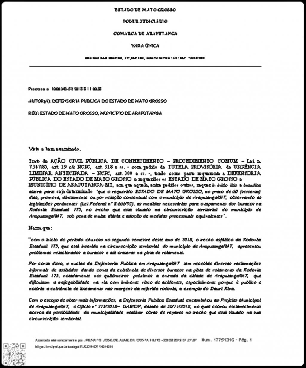 por - Sebastião Amorim - A Defensoria Pública do Estado de Mato Grosso, através do defensor dr. Carlos Wagner Matos entrou na Justiça com pedido de liminar, contra o Estado, para que o ente estadual adotasse medidas necessárias para tapamento dos buracos, na Rodovia MT-175, no trecho da circunscrição territorial do município de Araputanga/MT.