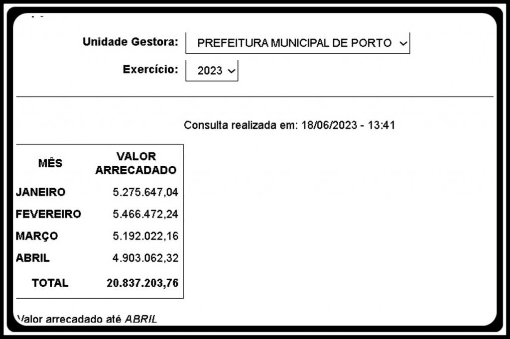 por - Sebastião Amorim - Nos primeiros cento e vinte dias de 2023, as contas do município de Porto Esperidião receberam um total de R$20.837.203,76 em arrecadação. A distribuição desses valores ao longo dos meses foi a seguinte:
