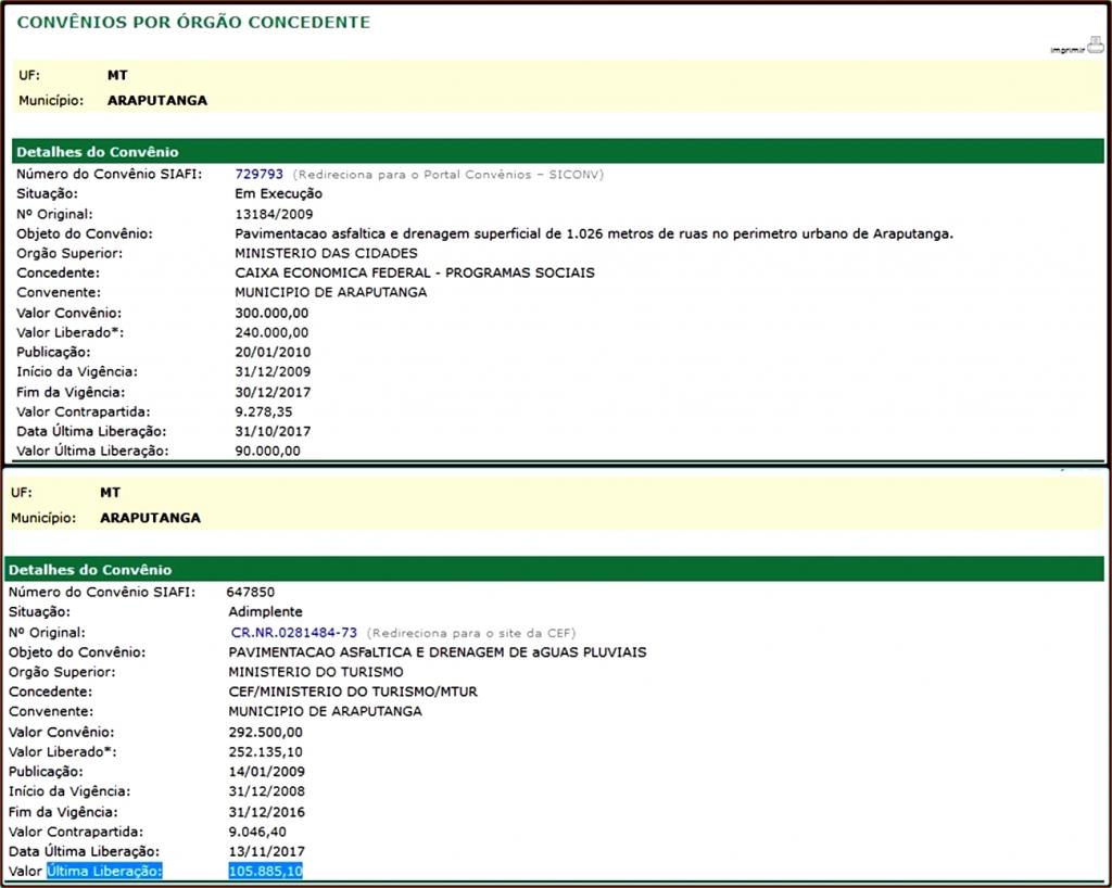 Desse convênio, Araputanga já recebeu R$ 252.135,10 restando cerca de quarenta mil reais para completar o montante a ser repassado à municipalidade.