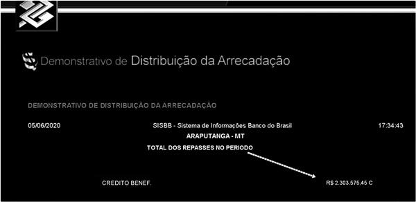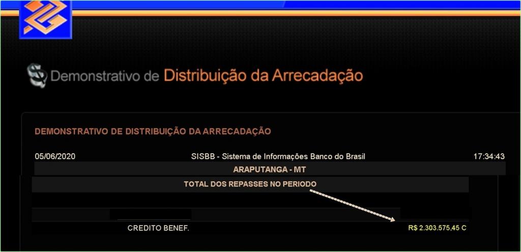 por - Sebastião Amorim - Repasses constitucionais feitos ao município de Araputanga no período 01 a 31 de maio de 2020 somaram R$R$ 2.303.575,45 (dois milhões trezentos e três mil, quinhentos e setenta e cinco reais).