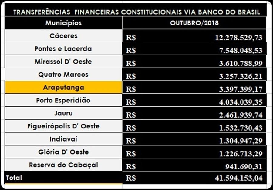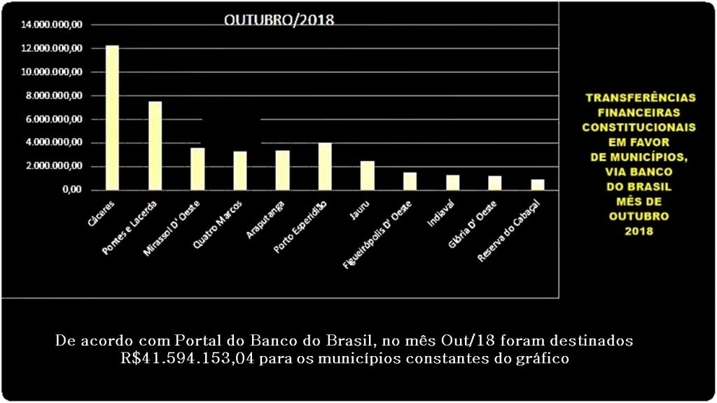 por Sebastião Amorim - As receitas constitucionais recebidas pelas gestões públicas dos municípios de Cáceres, Pontes e Lacerda, Mirassol D’ Oeste, São José dos Quatro Marcos, Araputanga, Porto Esperidião, Jauru, Figueirópolis D’ Oeste, Indiavaí, Glória D’ Oeste e, Reserva do Cabaçal, somaram 41.594.153,04 (quarenta e um milhões, quinhentos e noventa e quatro mil, cento e cinquenta e três reais), no mês de outubro 2018